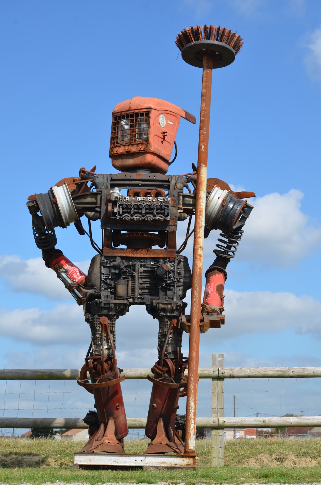 Ces créatures impressionnantes et assez réalistes (avec un peu d’imagination 😉 ont été conçues par un ancien ouvrier virtuose du fer à souder. Les matériaux utilisés sont d’origines diverses (automobile, agricole, mobilier urbain etc.), et tout est récupéré dans les déchets de la société. L’oeuvre de cet artiste est une critique de la société, grande consomatrice et productrice de déchets difficilement renouvelable, alors comme on est d’accord on fait passer le message !