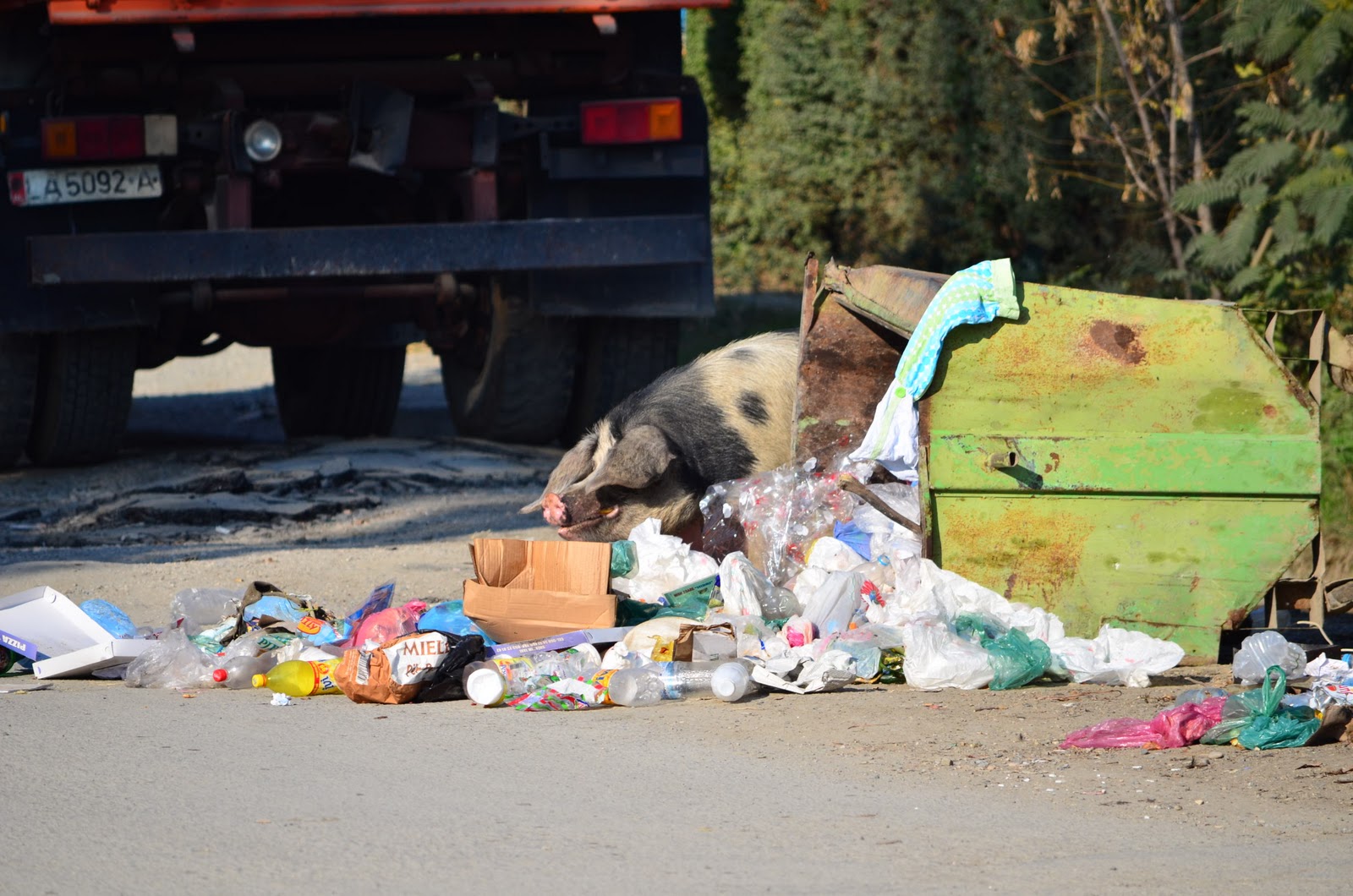 | Tiens, un conteneur ! Nous sommes dans une ville, le cochon se charge du nettoyage ! |