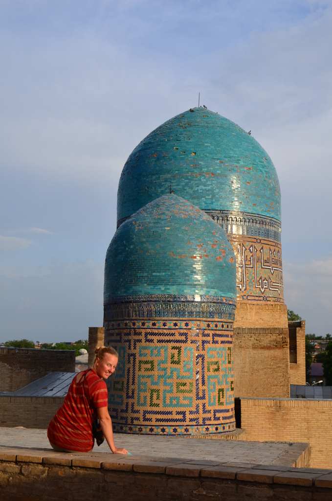 On a posé devant des mausolées aux dômes turquoises, une couleur caractéristique de la région: