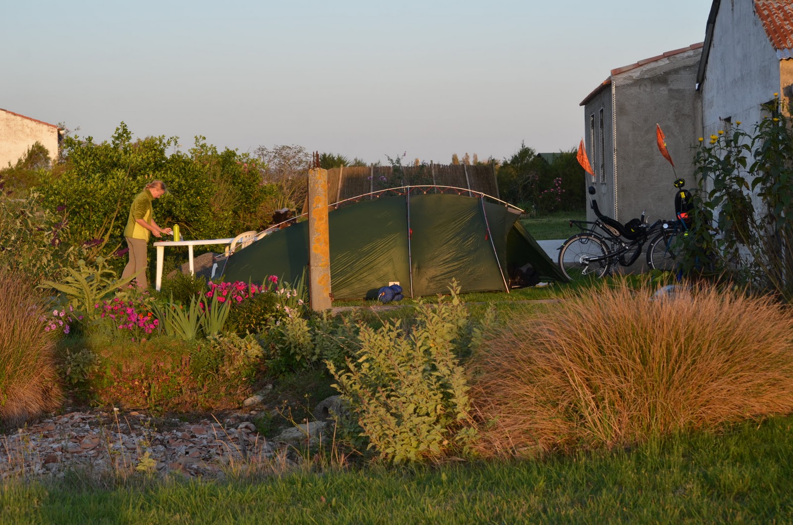 Avant que la nuit tombe, nous nous mettons en quête d’une maison possédant un jardin pour y demander une petite place pour notre tente. Nous ne visons pas de maison particulière, toute maison est éligible ! Nous avons remarqué qu’il est plus facile tout de même de demander lorsque les propriétaires sont dehors et nous voient arriver, au moins nous voyons si nous ne dérangeons pas les gens au milieu de quelque chose ! Si personne ne se trouve dehors, nous sonnons à la porte ou à l’interphone pour faire notre petit speech.