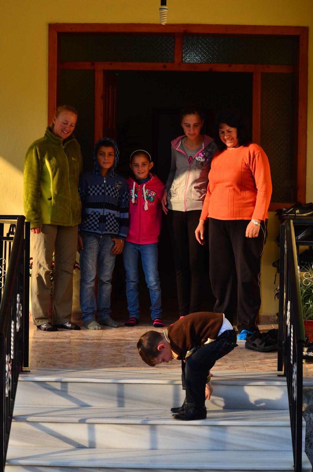 Nous avons toujours été bien reçus, la plupart du temps invités à la table du soir pour goûter aux spécialités tant culinaires que d’usage. Par exemple, on n’utilise pas de couteaux, mais on mange avec les doigts. Guilhem se fait toujours offrir un verre de Raki qu’il ne termine pas, mais « pas problème ! ». Comme il commence à faire froid, nous avons souvent dormi chez les gens, avec d’énormes couvertures !
