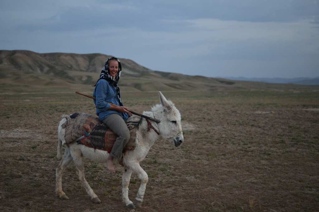 Et voilà ce qu’il y a de chouette avec ces gens, c’est qu’au milieu de nulle part justement, ils arrivent, pof ! Par curiosité, tranquillement, nous voyons arriver sur une moto deux jeunes bergers. Ils se posent avec nous, on communique en souriant mais sans trop se comprendre … le mieux est toujours de boire un petit thé ! Les voilà donc qui s’en vont chercher tout ce qu’il faut : du thé, de l’eau, des tasses, du sucre, du bois pour faire chauffer (alors qu’il n’y a pas d’arbres à des kilomètres à la ronde) et un âne pour porter le tout ! Et c’est parti, jusqu’à la tombée de la nuit, on est posé autour du feu à siroter ce petit thé. Entre temps, un troisième berger nous rend visite, je fais un petit tour en âne, on rigole bien !