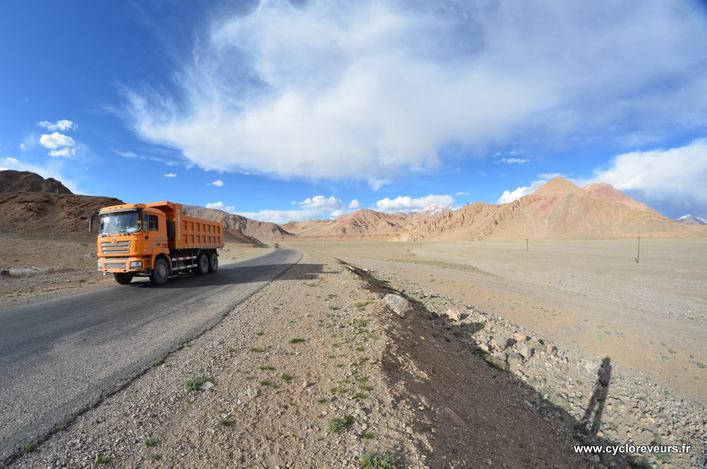 Quelques camions chinois circulent sur cette route, pour contruire ou entretenir les routes. |